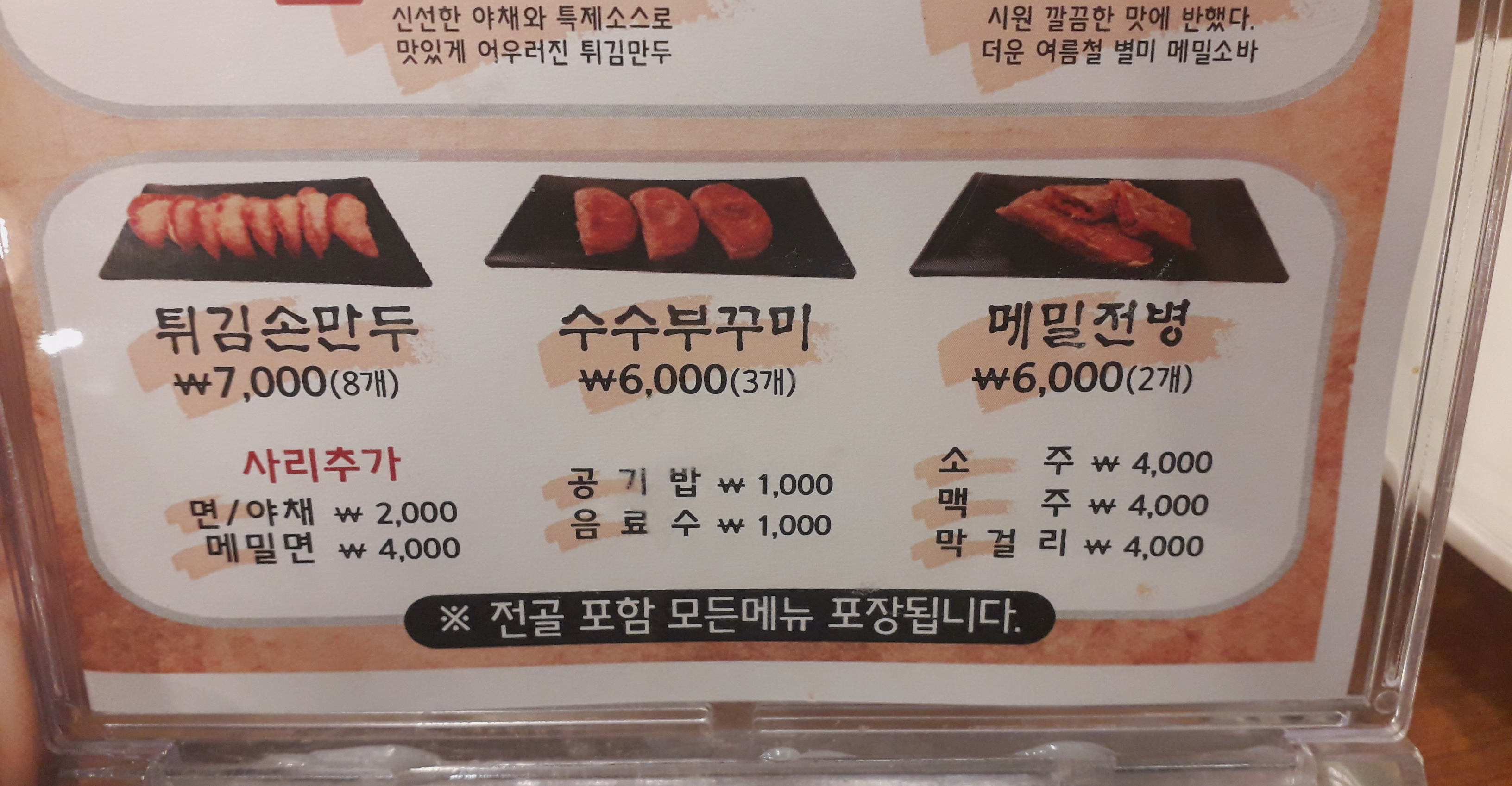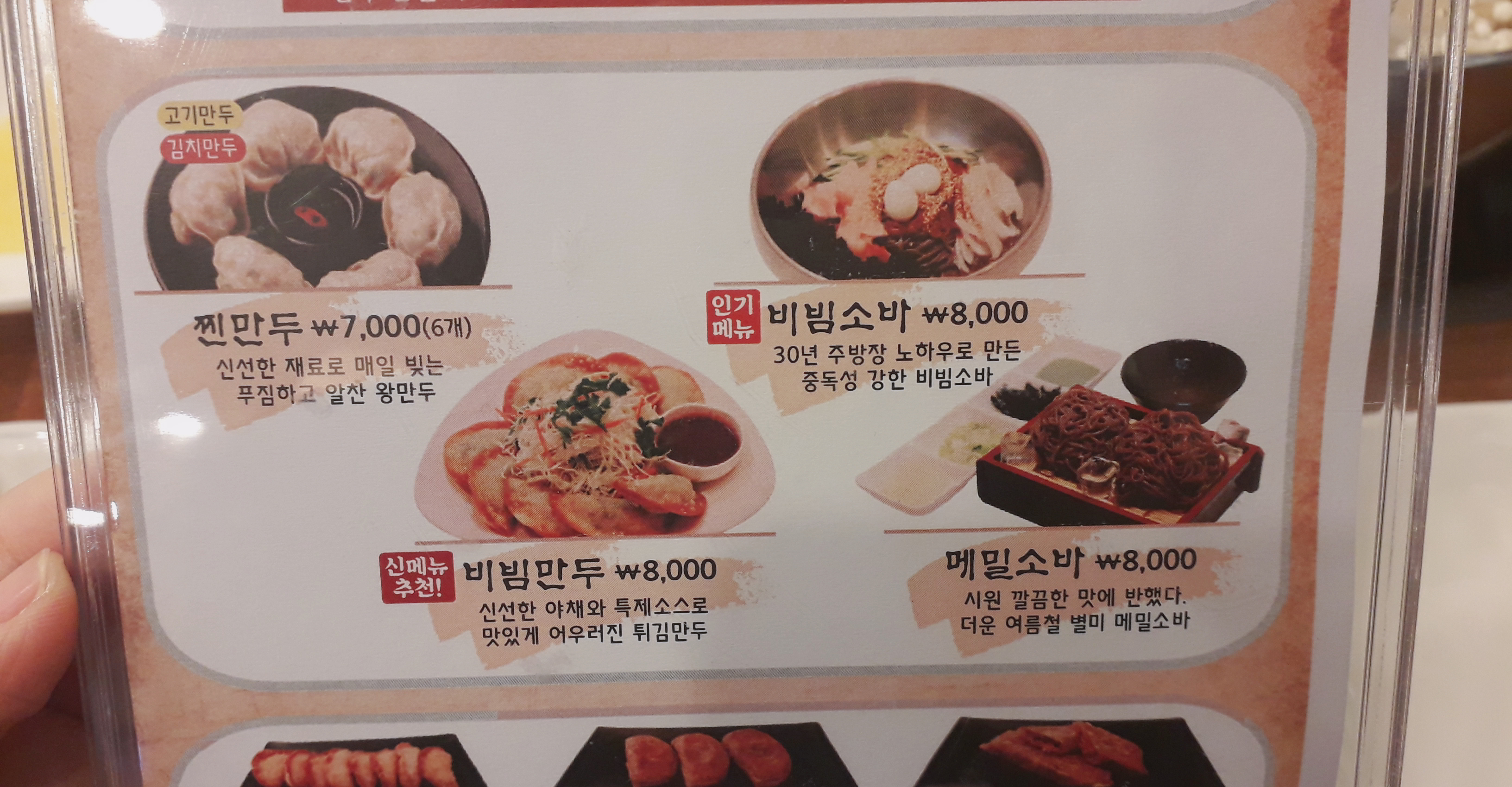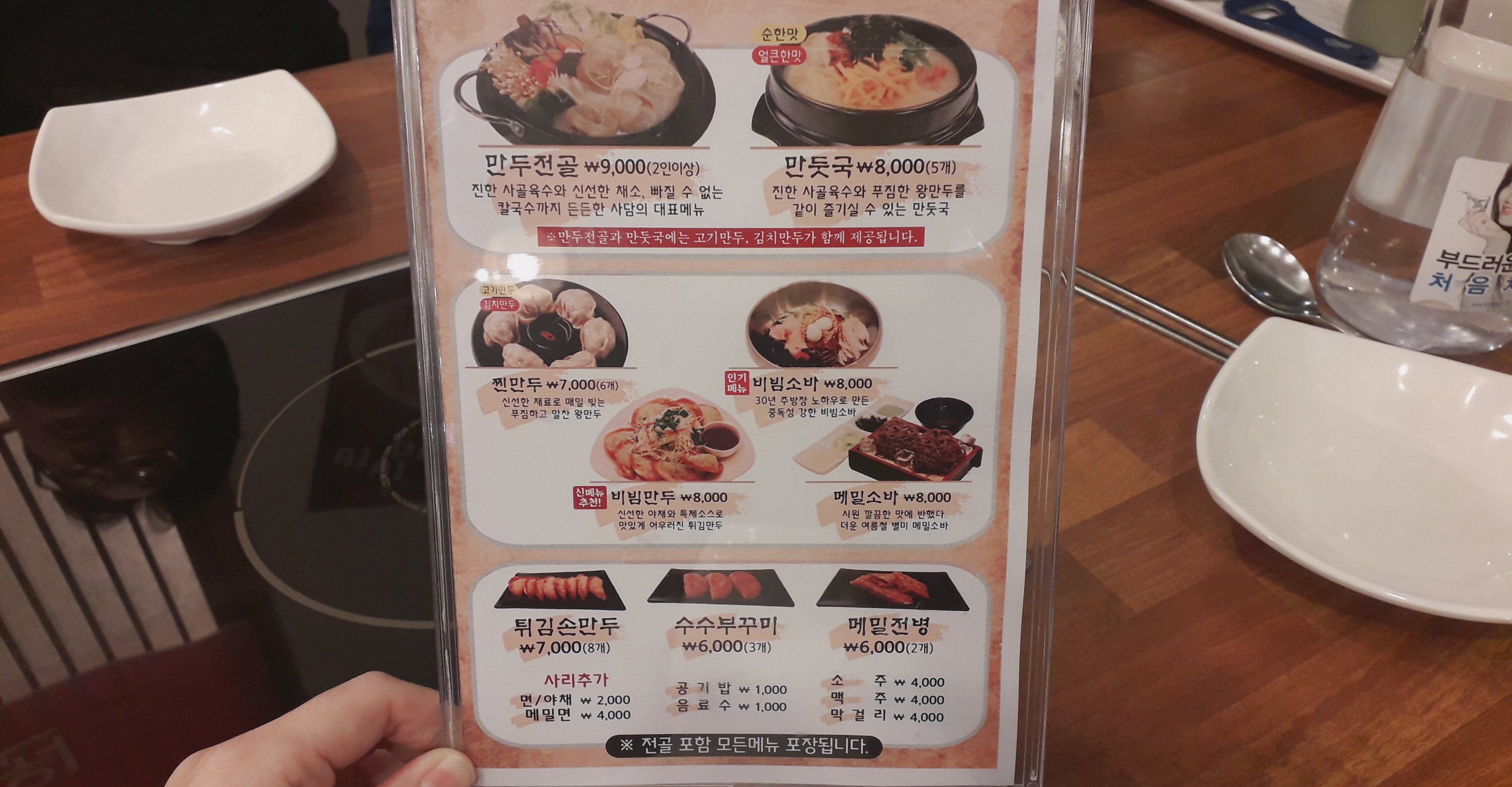 만두전골 9,000원, 만둣국 8,000원, 찐만두 7,000원, 메밀소바8,000원, 비빔만두 8,000원, 비빔소바 8,000원, 튀김손만두 7,000원, 수수부꾸미 6,000원, 메밀전병 6,000원 정도로 모두 1인분에 만원을 넘지 않아서 부담없이 먹기 좋습니다.