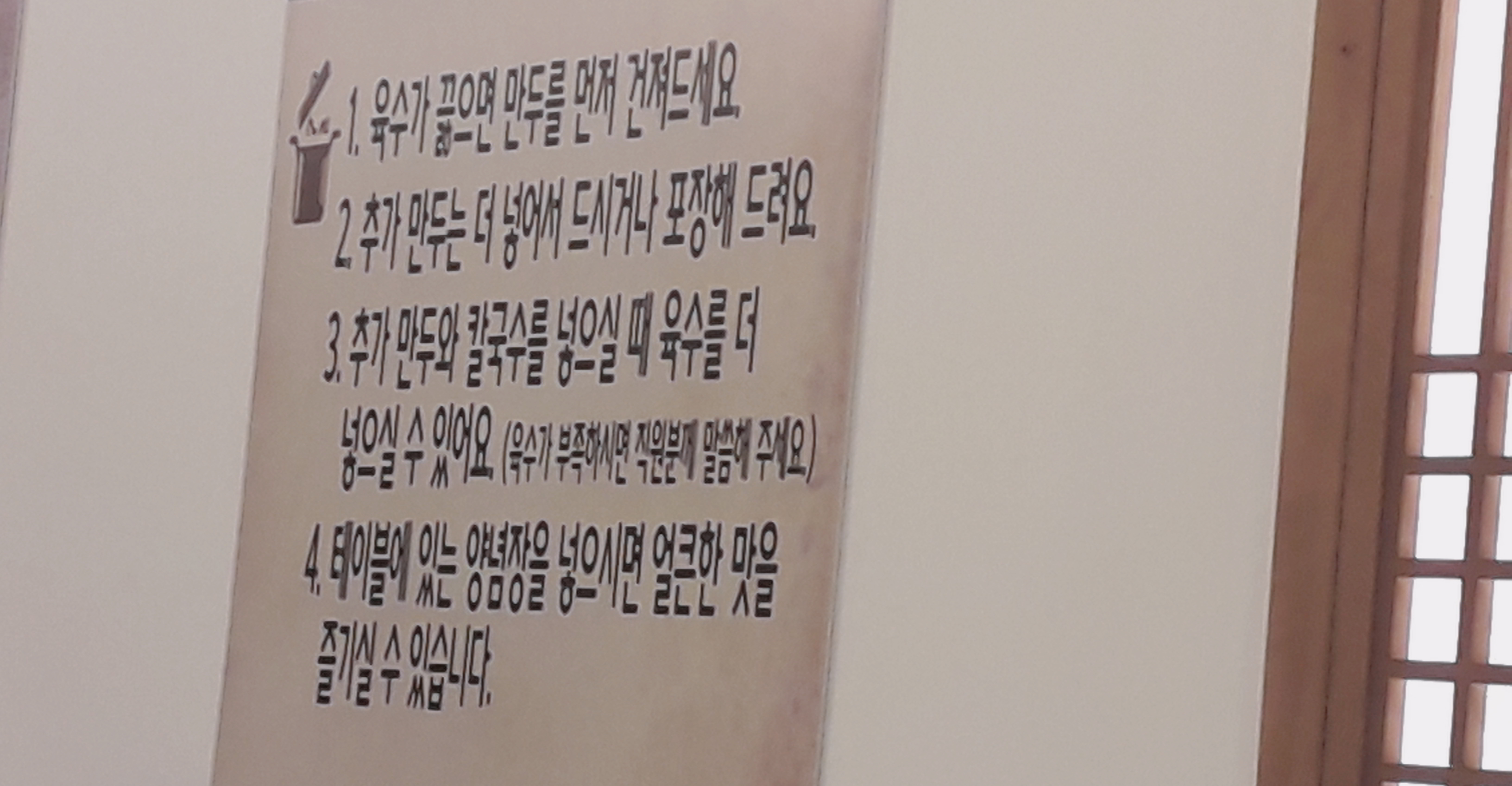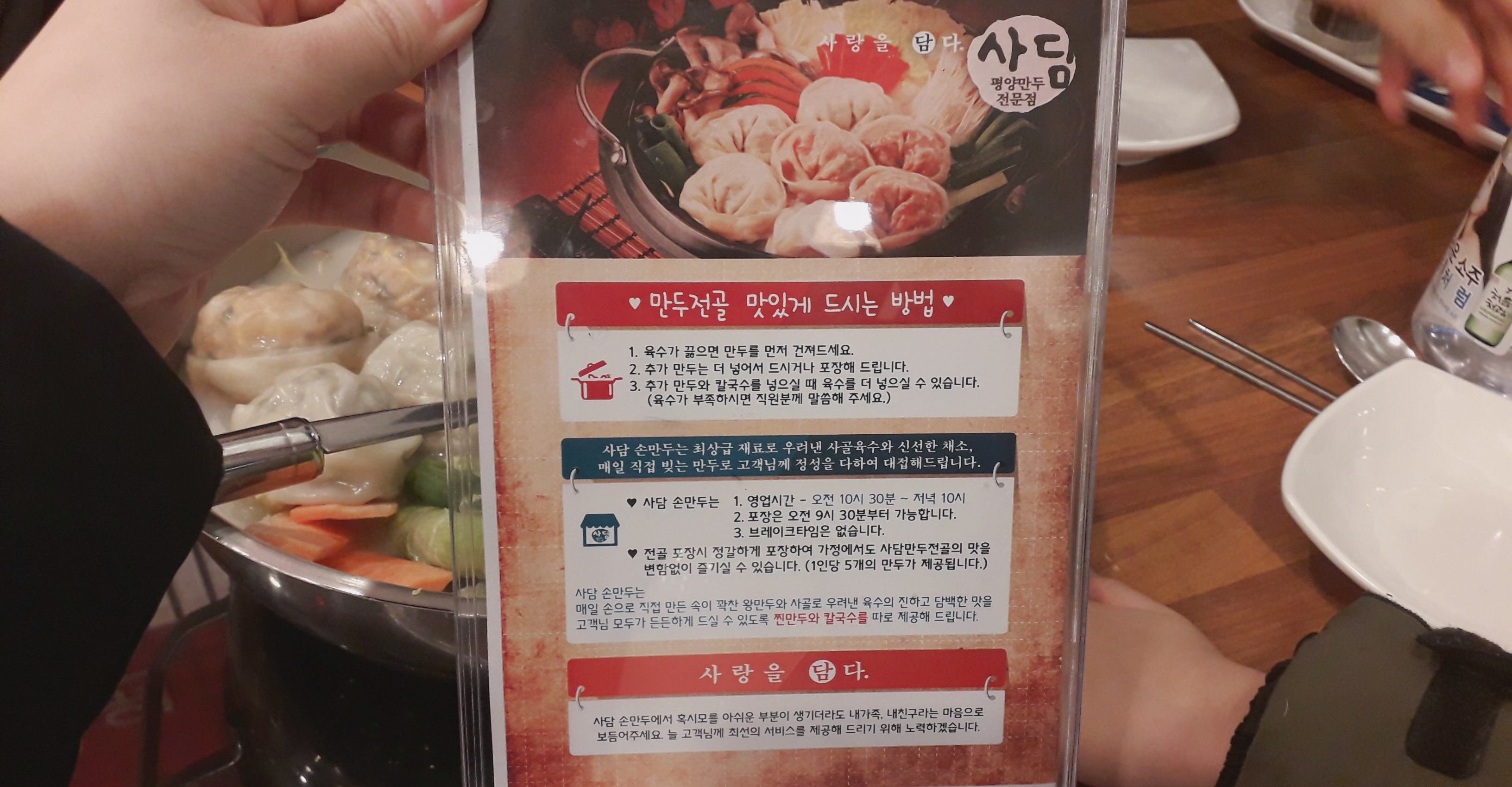 메뉴판 뒤와 식당 벽에 만두전골 맛있게 먹는 방법이 붙어있었습니다.