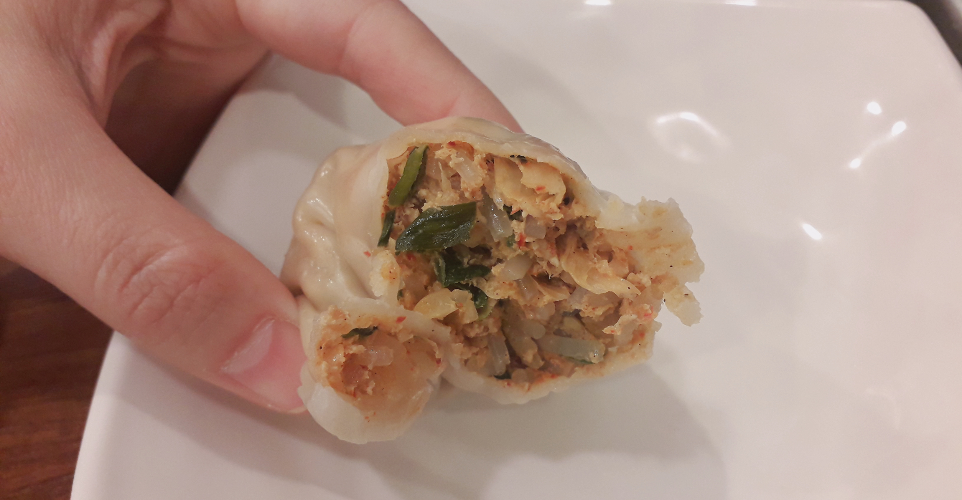 김치만두의 속입니다. 여느 김치만두와 크게 다르지 않은데요 살짝 매콤한 맛이 있어서 고기만두의 느끼함을 김치만두가 잊게 해 준답니다.