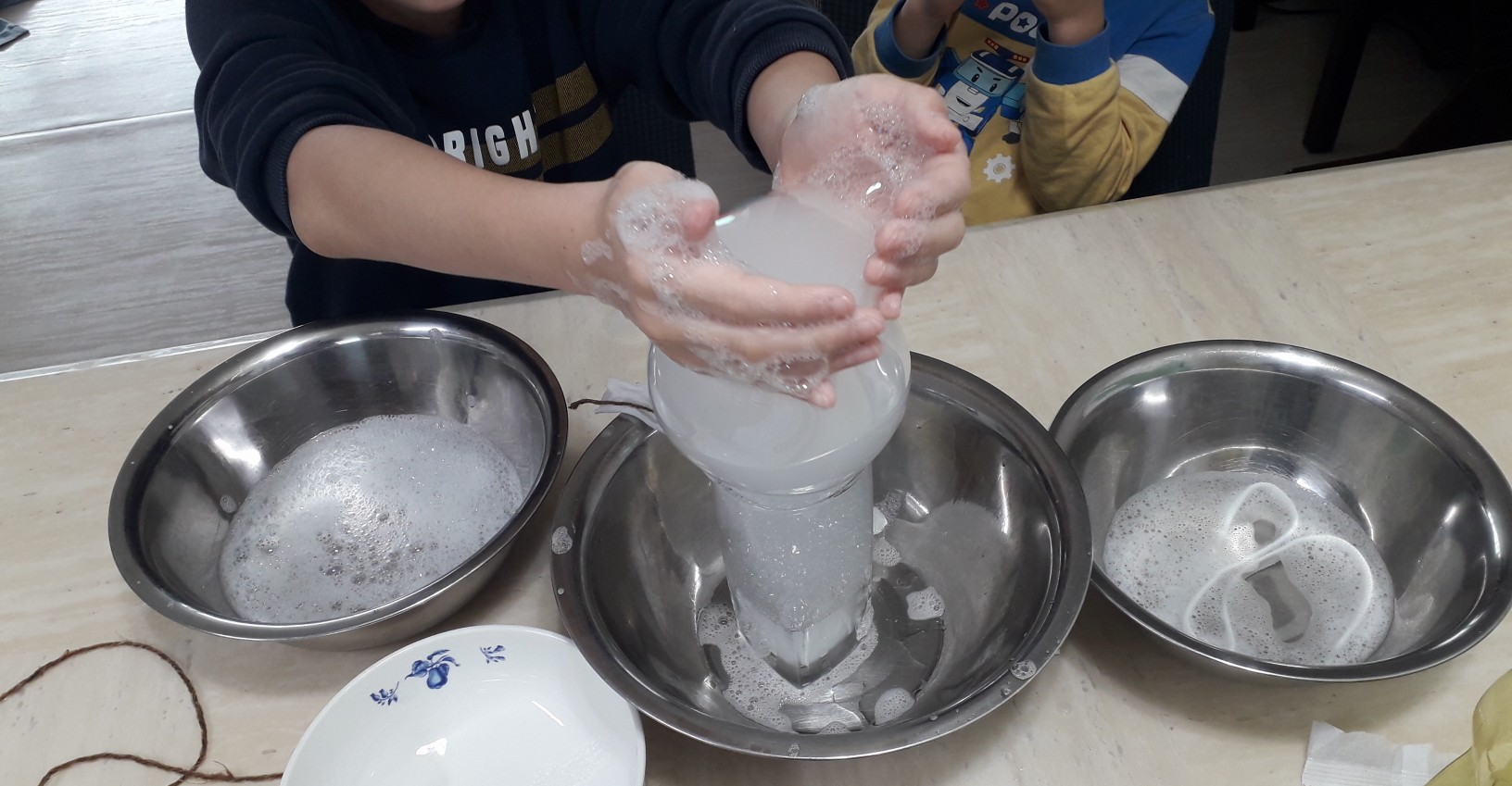 유리컵에 비눗물을 조금 더 많이 넣고 뜨거운 물도 더 넣었더니 이렇게 거품 기둥이 생기면서 드라이아이스 비눗방울 실험의 대미를 장식했습니다. 실험을 하는 동안 아이들이 놀이 처럼 느낄 수 있어서 참 즐거웠던 시간이었습니다.