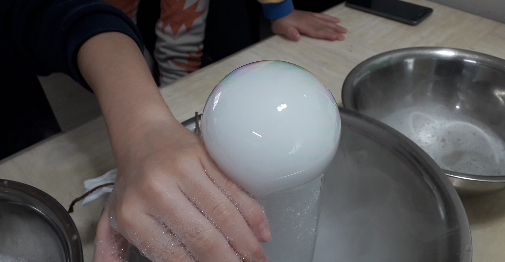 정말 거대한 드라이아이스 비눗방울이 되었죠? 이것을 지켜보면서 언제터질까 하며 조마조마 하게 지켜보는 재미가 어른인 저도 꽤나 흥미로웠습니다.