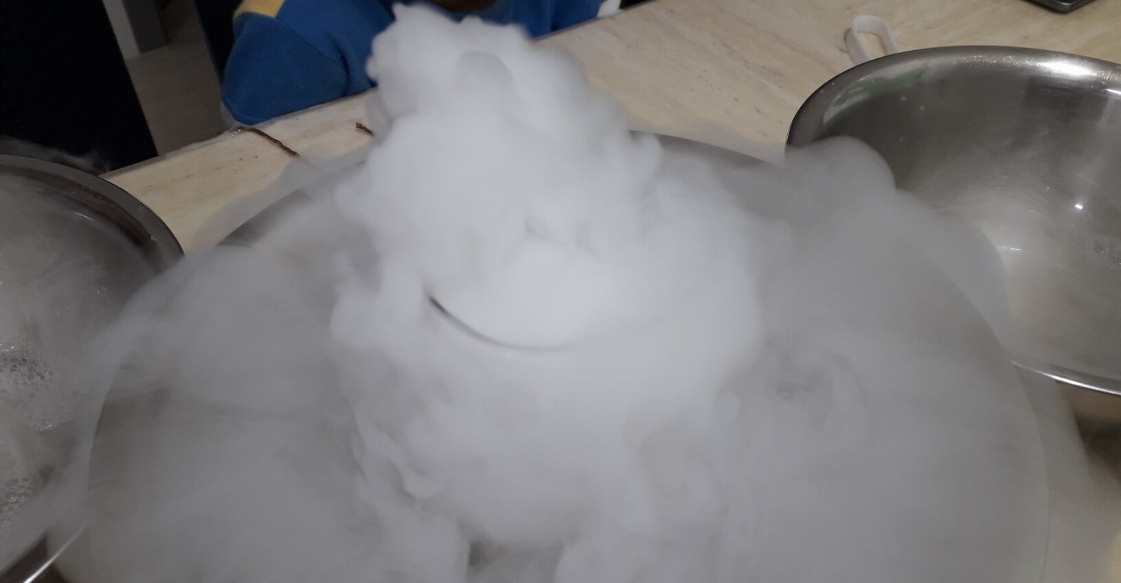 드라이아이스는 그냥 공기 중에 두면 저절로 천천히 승화되어 없어지지만 위의 사진 처럼 드라이아이스 승화 과정을 눈에 띄게 하려면 뜨거운 물을 조금 부어주면 됩니다.