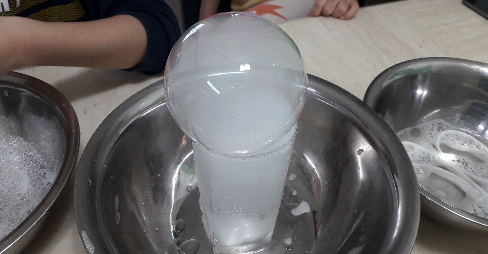 드라이아이스가 계속 승화가 되고 있어서 컵 입구에 비눗물만 뭍여줘도 계속 비눗방울 저절로 생겨서 충분히 재미있는 실험이 진행됩니다.