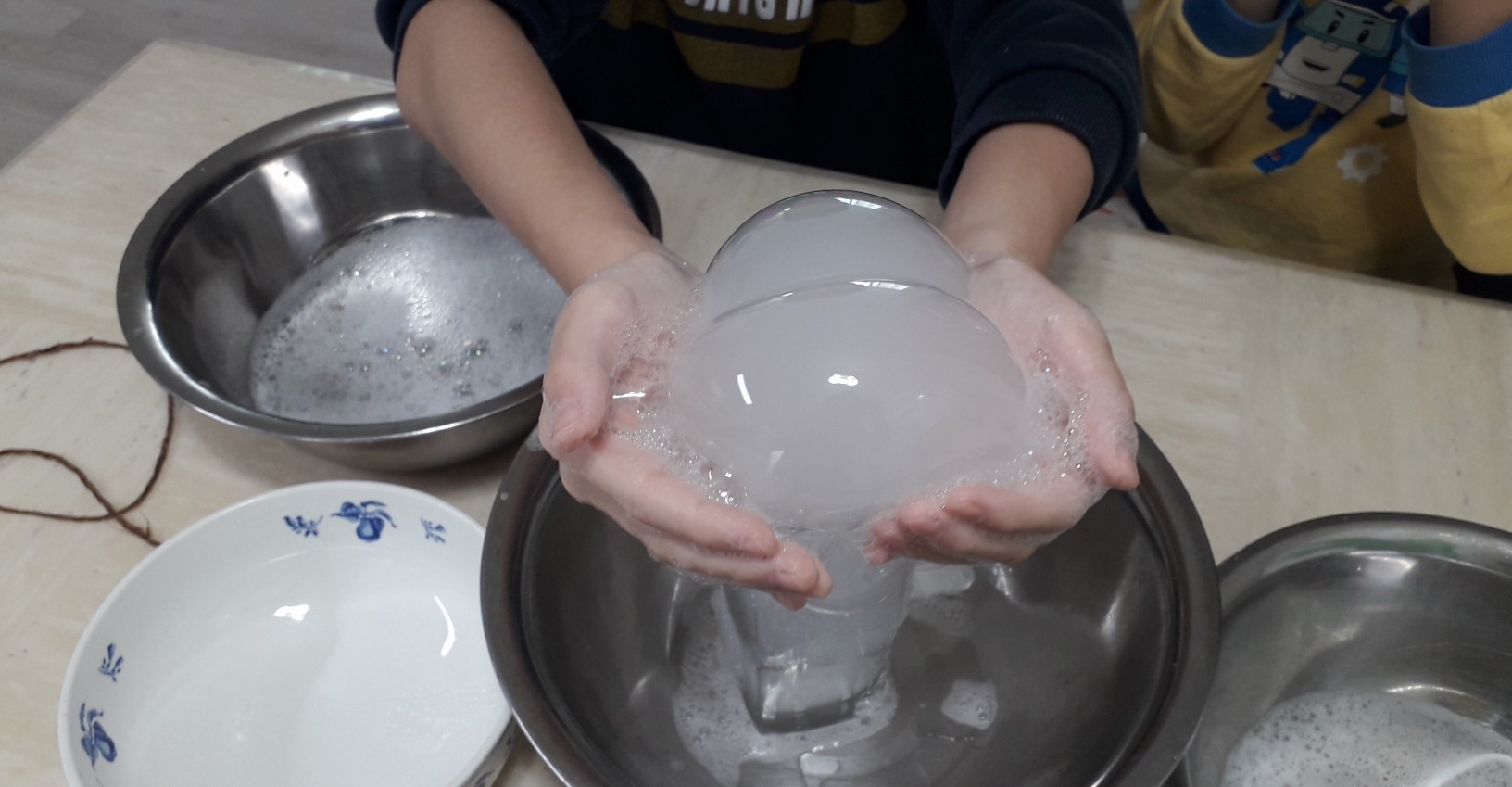 투명하고 하얀색의 저절로 커지는 비눗방울을 직접 만져보는 느낌은 옆에서 보기에도 충분히 즐거워 보였습니다.