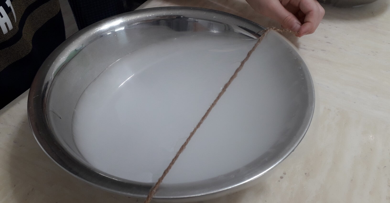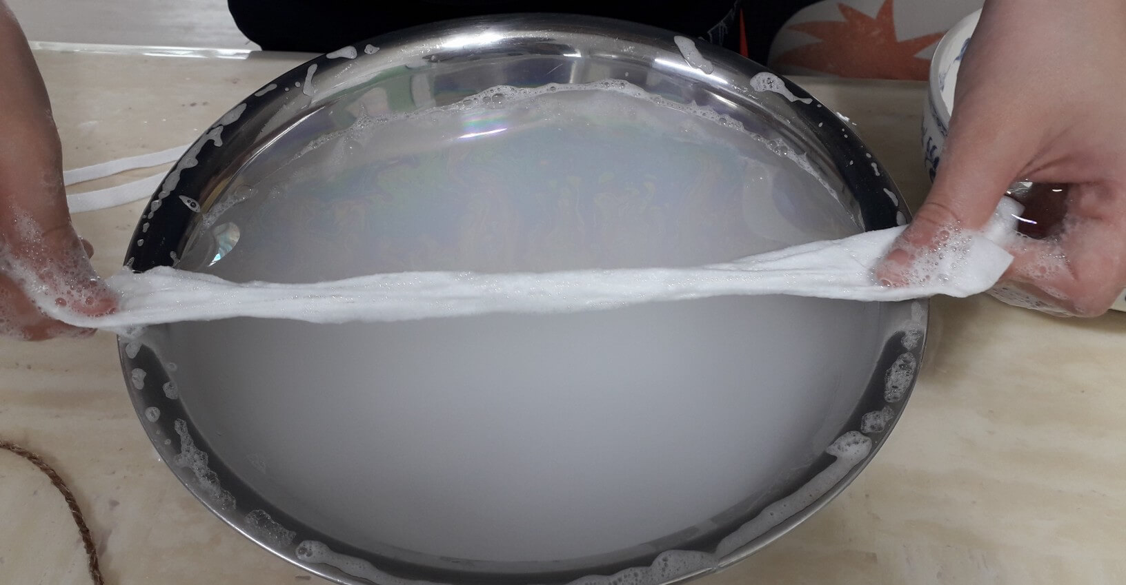 그러면 다시 비눗방울을 만드는 재미에 아이들은 시간 가는 줄을 모른답니다. 그런데 과학실험을 하다보니 한가지 팁을 알게 되었는데요, 털실 보다는 물티슈를 길게 늘여서 세제물을 뭍히는 것이 훨씬 더 잘 되었습니다.