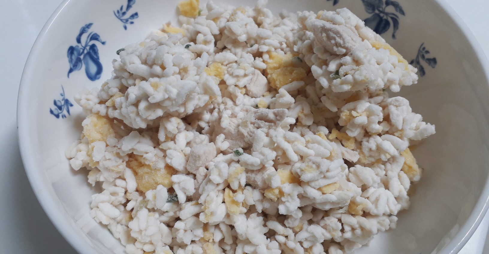 저는 간편하게 전자렌지를 이용해서 데우는데요, 위의 사진이 냉동 상태의 간장계란밥을 그대로 쏟아부어 담은 모습입니다.