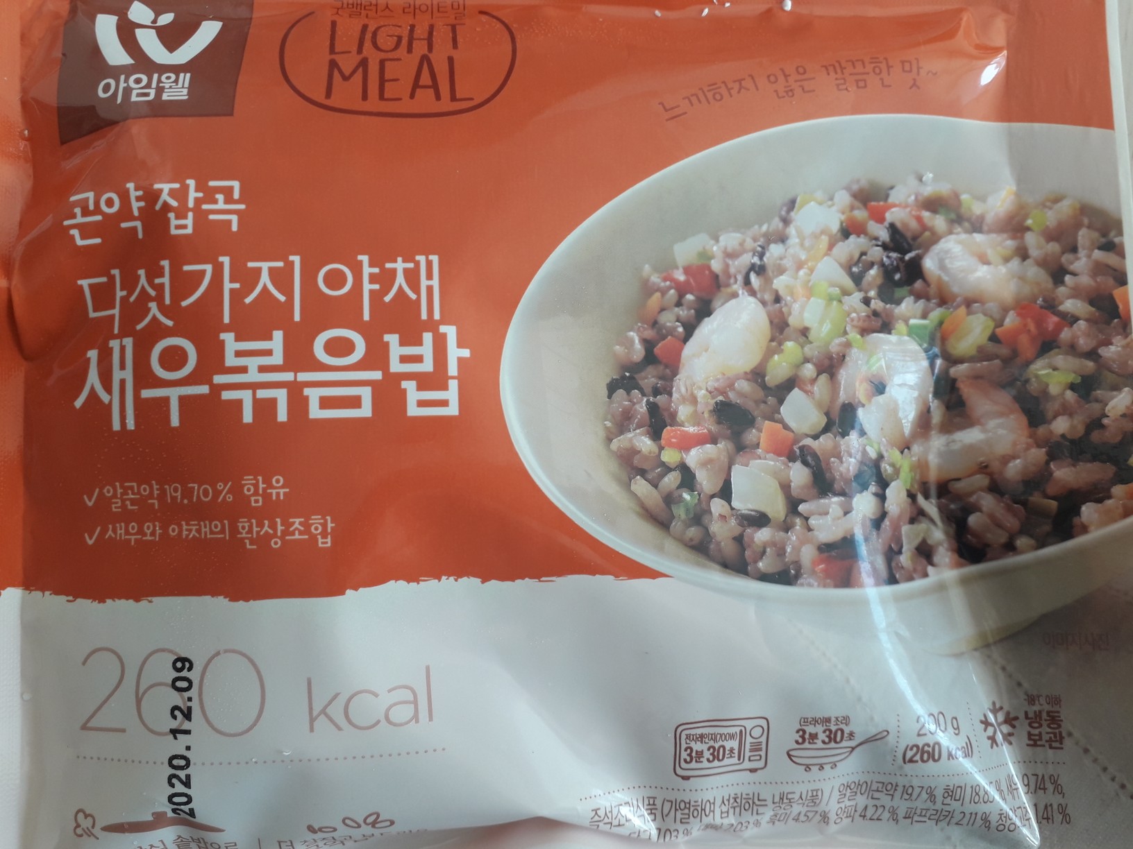 다음으로 아임닭 곤약 잡곡 다섯가지 야채 새우볶음밥을 데웠는데요, 새우와 야채가 들어가서 그런지 칼로리는 260kcal로 가장 낮았습니다.