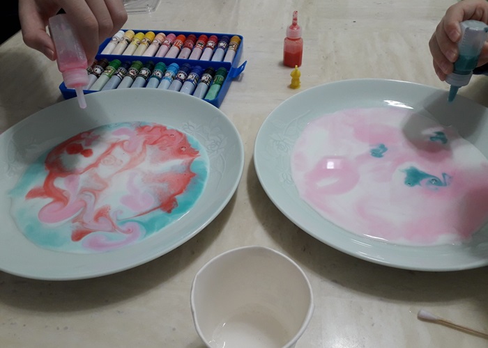 이때 왜 이런 마블링이 생기는지 이유를 설명해줘야 진정한 과학놀이라고 할 수 있겠죠?