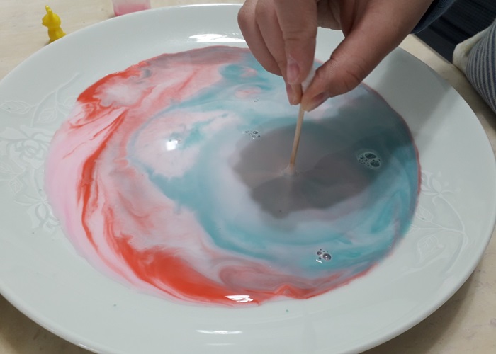 과학놀이 설명 : 액체상태의 물질은 분자들이 흩어지지 않으려고 서로 끌어당기는 힘인 표면장력이 있다. 그래서 우유에 물감을 떨어 뜨려도 같은 색의 물감이 서로 모여 있게 되는데 여기에 세제를 떨어 뜨리면 세제가 표면장력을 약하게 만들어 물감들이 뿔뿔이 흩어지게 되는 것이다.