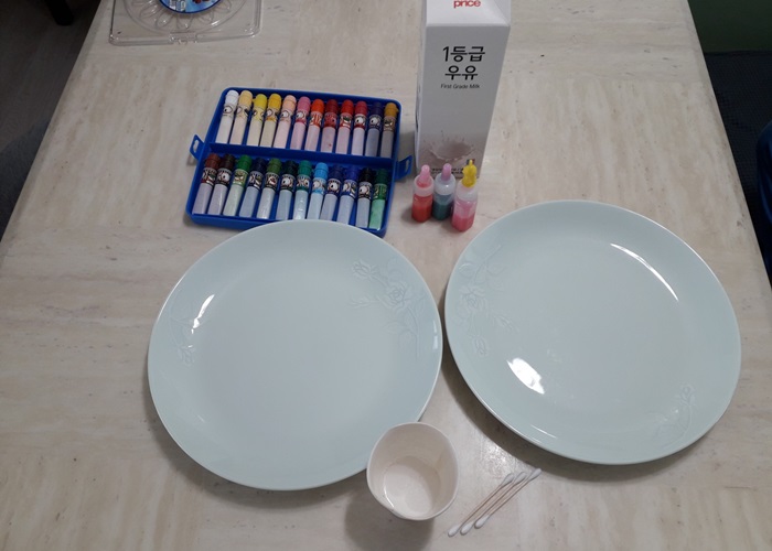우유, 넓은 접시나 쟁반, 물감, 작은 물약통, 세제, 면봉