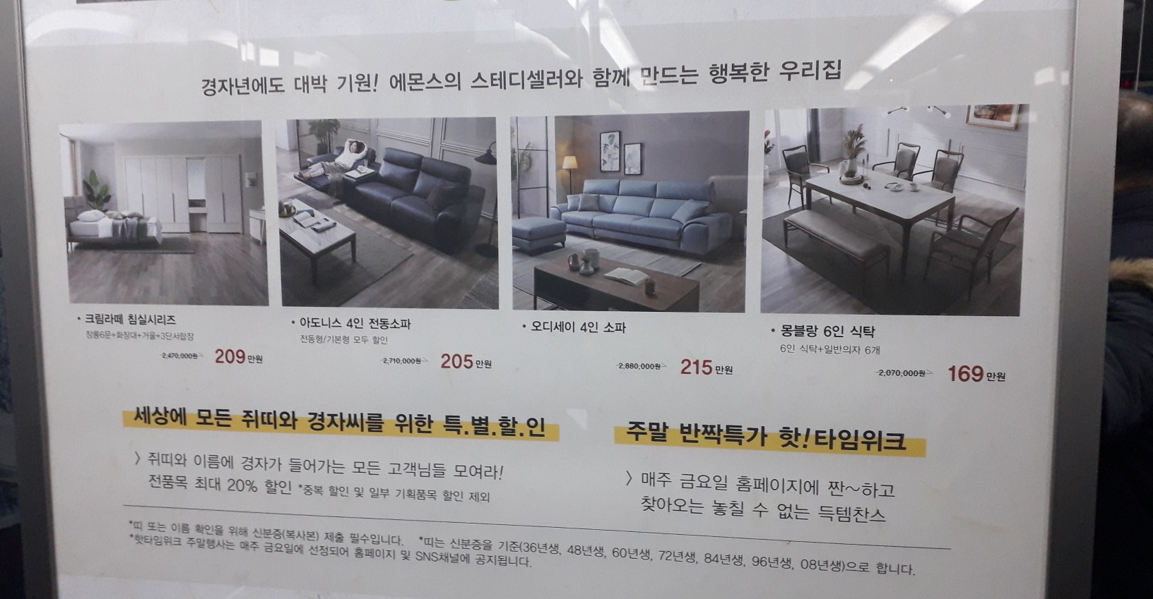 그리고 또 다른 재미있는 이벤트도 있었는데요, 쥐띠와 이름에 경자가 들어가는 모든 고객에겐 전품목 최대 20% 할인을 해주기도 하고, 주말엔 반짝특가로 매주 금요일 홈페이지에 핫! 타임위크로 득템찬스가 있다고 하니 가구를 사려는 예정이 있는 분들이라면 놓치지 마세요.