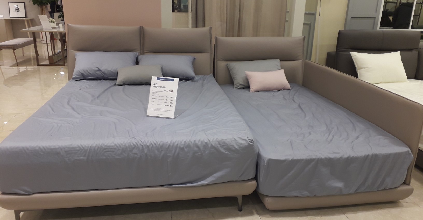 리클라이너 침대 뿐만 아니라 물론 위와 같은 원목 침대도 많이 있었습니다. 하지만 저희는 안방에 TV를 둘 예정이라 등받이 기능도 되는 침대를 사기로 했습니다.