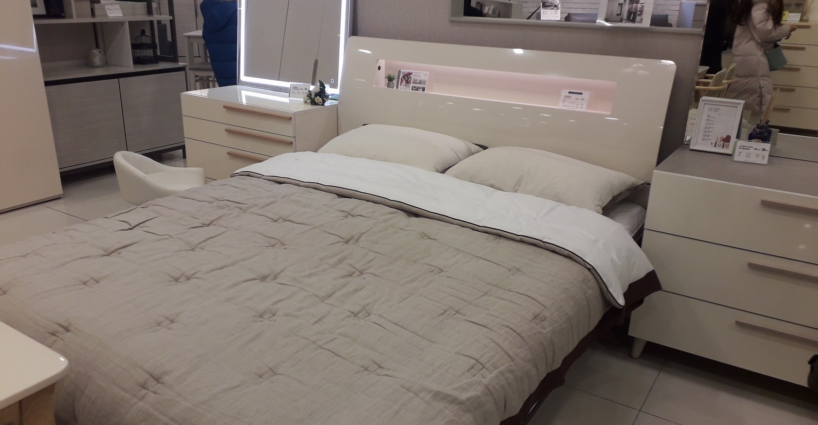 이런 밝은 톤의 가구 들을 보니 신혼 느낌이 확 나네요. 또 요즘엔 침대 헤드에 조명도 들어 있고, USB 충전 단자가 붙어져 있는 제품이 대부분 이었습니다. 확실히 편하긴 하겠습니다.